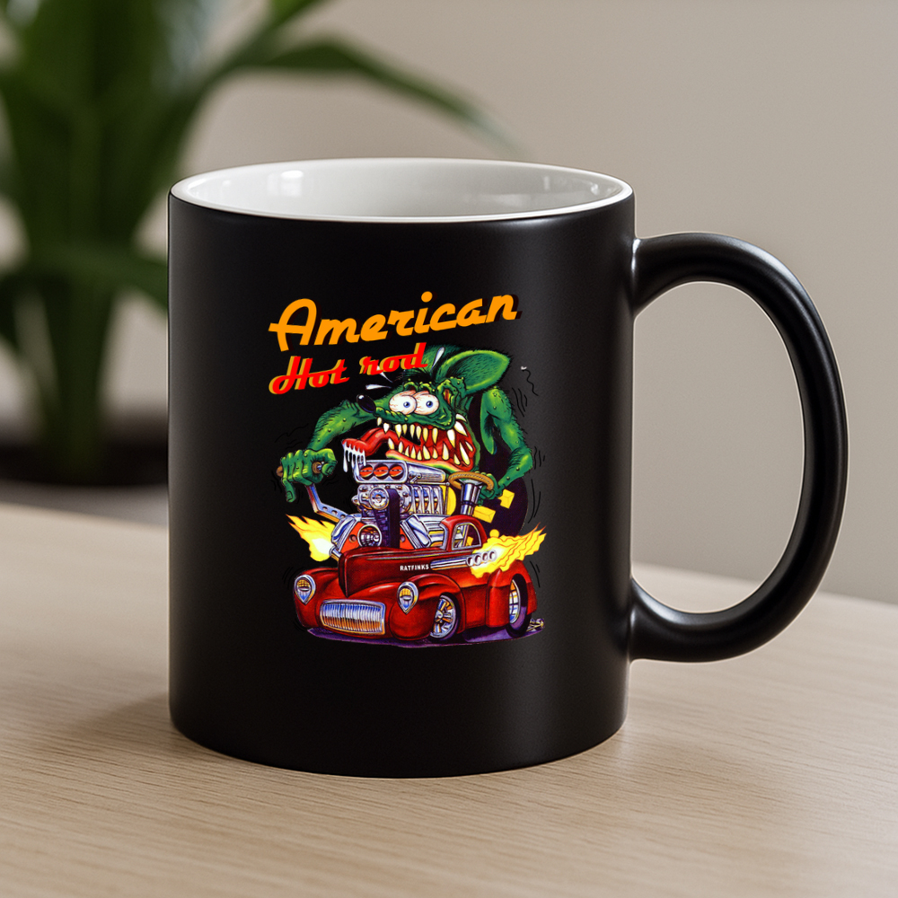 Welcome to TeeTurbo.com, your garage-fueled gear hub. Now you can rev up your mornings with a mug that screams attitude. Inspired by hotrods, Rat Fink chaos, and classic garage grit, this black ceramic mug isn’t just drinkware — it’s a lifestyle statement.