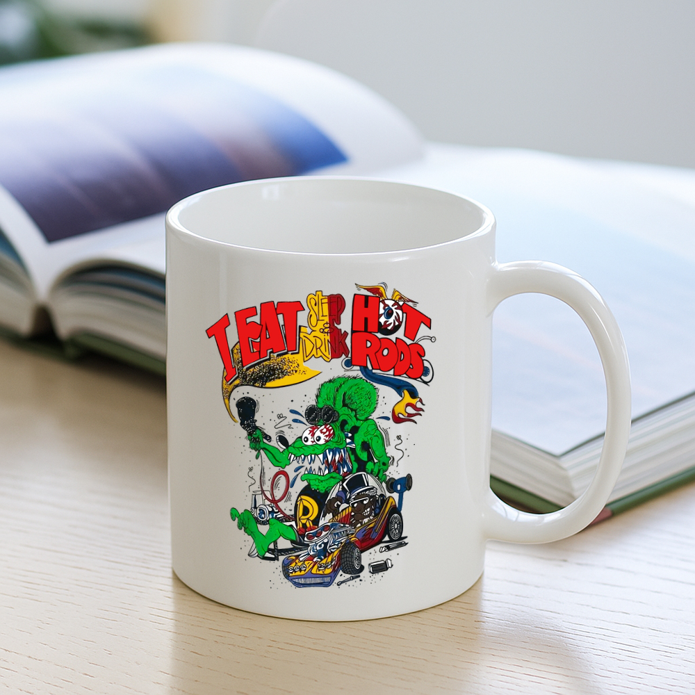 Welcome to TeeTurbo.com, your garage-fueled gear hub. Now you can rev up your mornings with a mug that screams attitude. Inspired by hotrods, Rat Fink chaos, and classic garage grit, this black ceramic mug isn’t just drinkware — it’s a lifestyle statement.