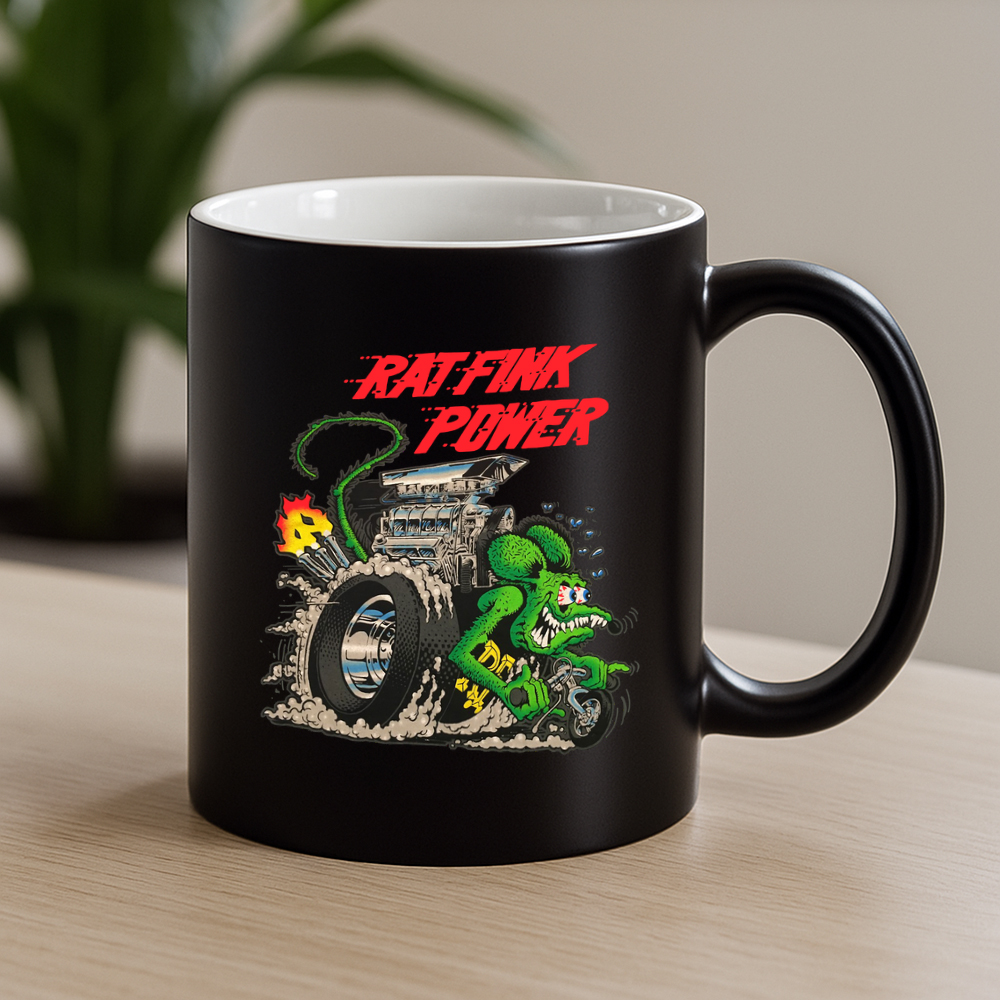 Welcome to TeeTurbo.com, your garage-fueled gear hub. Now you can rev up your mornings with a mug that screams attitude. Inspired by hotrods, Rat Fink chaos, and classic garage grit, this black ceramic mug isn’t just drinkware — it’s a lifestyle statement.