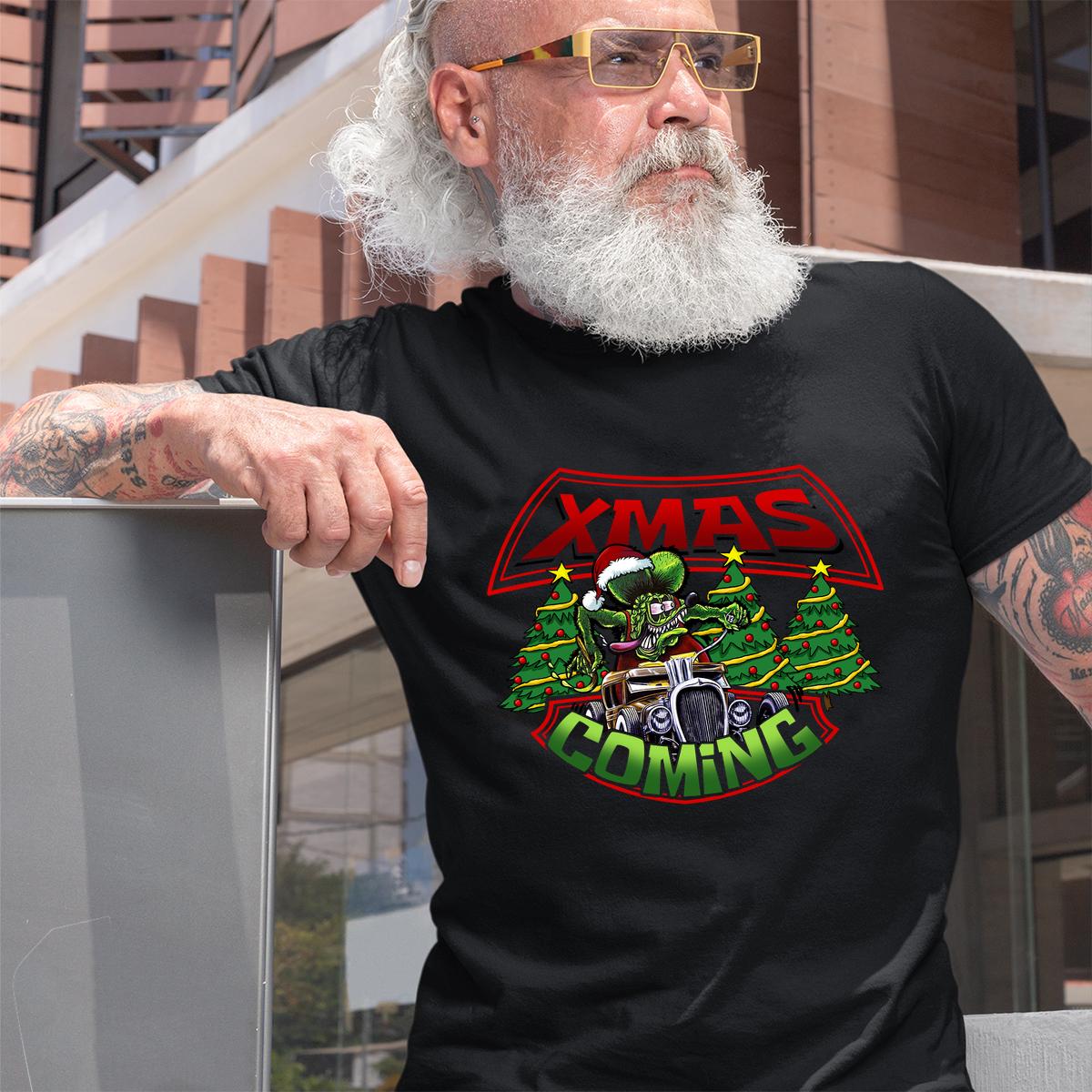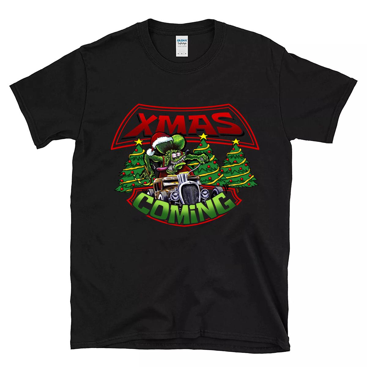 Rat Fink Xmas Coming T-Shirt – edgy, bold, and full of holiday hot rod energy. Inspired by underground garage art and the raw power of classic muscle, this tee is made for rebels, gearheads, and Kustom Kulture fans who bring attitude to the season.
