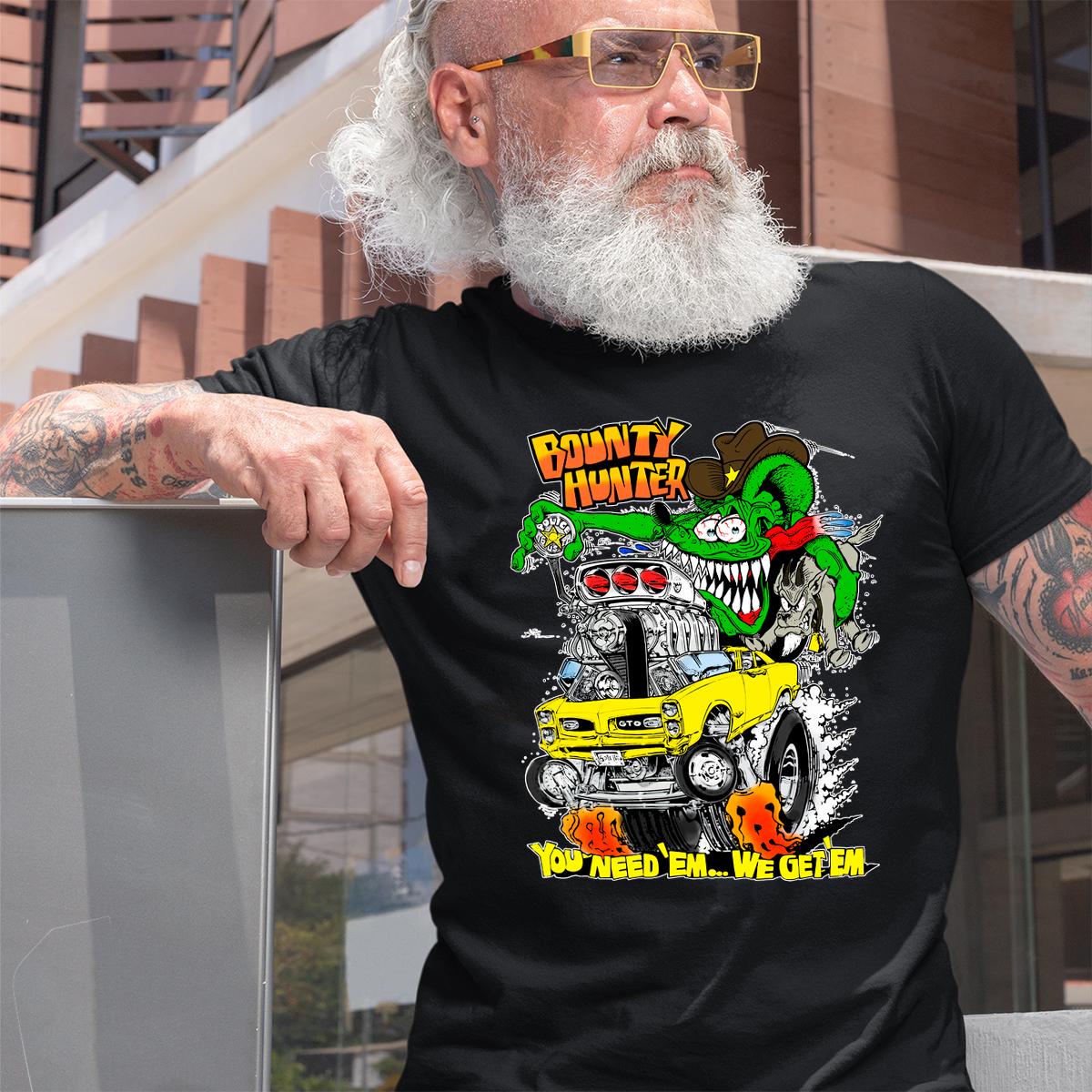 The Bounty Hunter shirt brings the heat—perfect for nights in the garage, chasing asphalt at full throttle, or standing bold at the next car show. Loud, gritty, and unapologetically wild, it’s Rat Fink with outlaw energy.