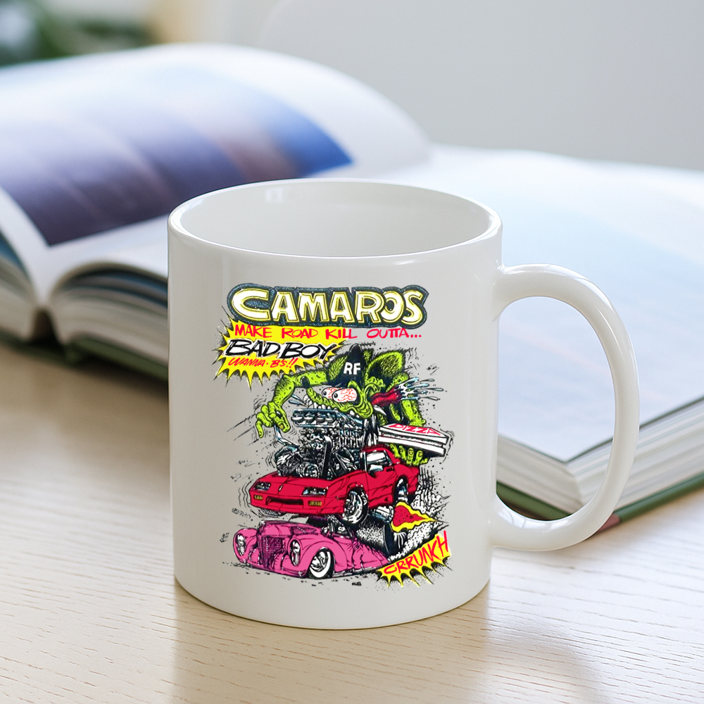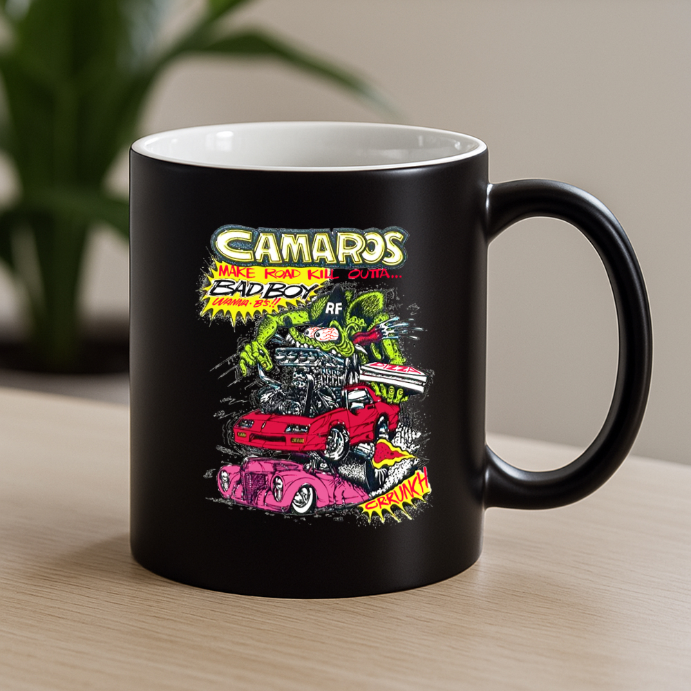 Made from glossy black ceramic and available in 11oz and 15oz sizes, each mug is printed with high-quality sublimation for bold, vivid artwork that pops. It’s built for the wrenchers, caffeine addicts, and midnight designers who live loud and sip harder.