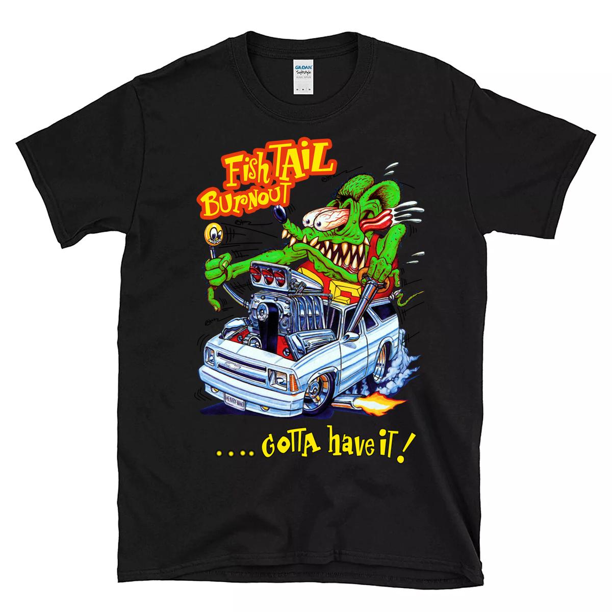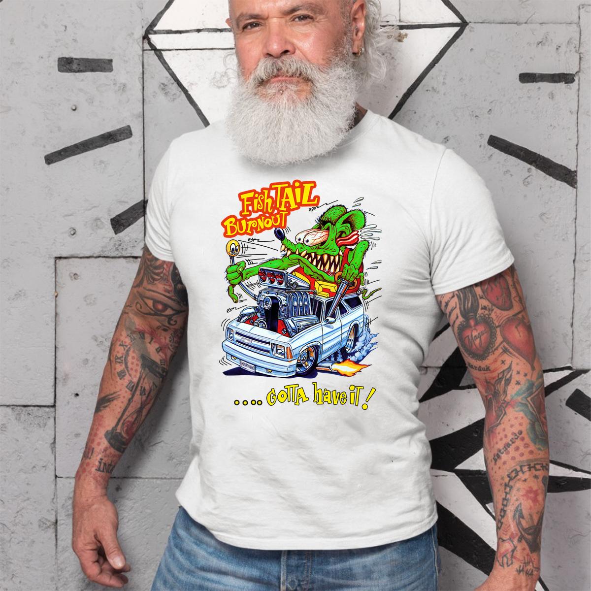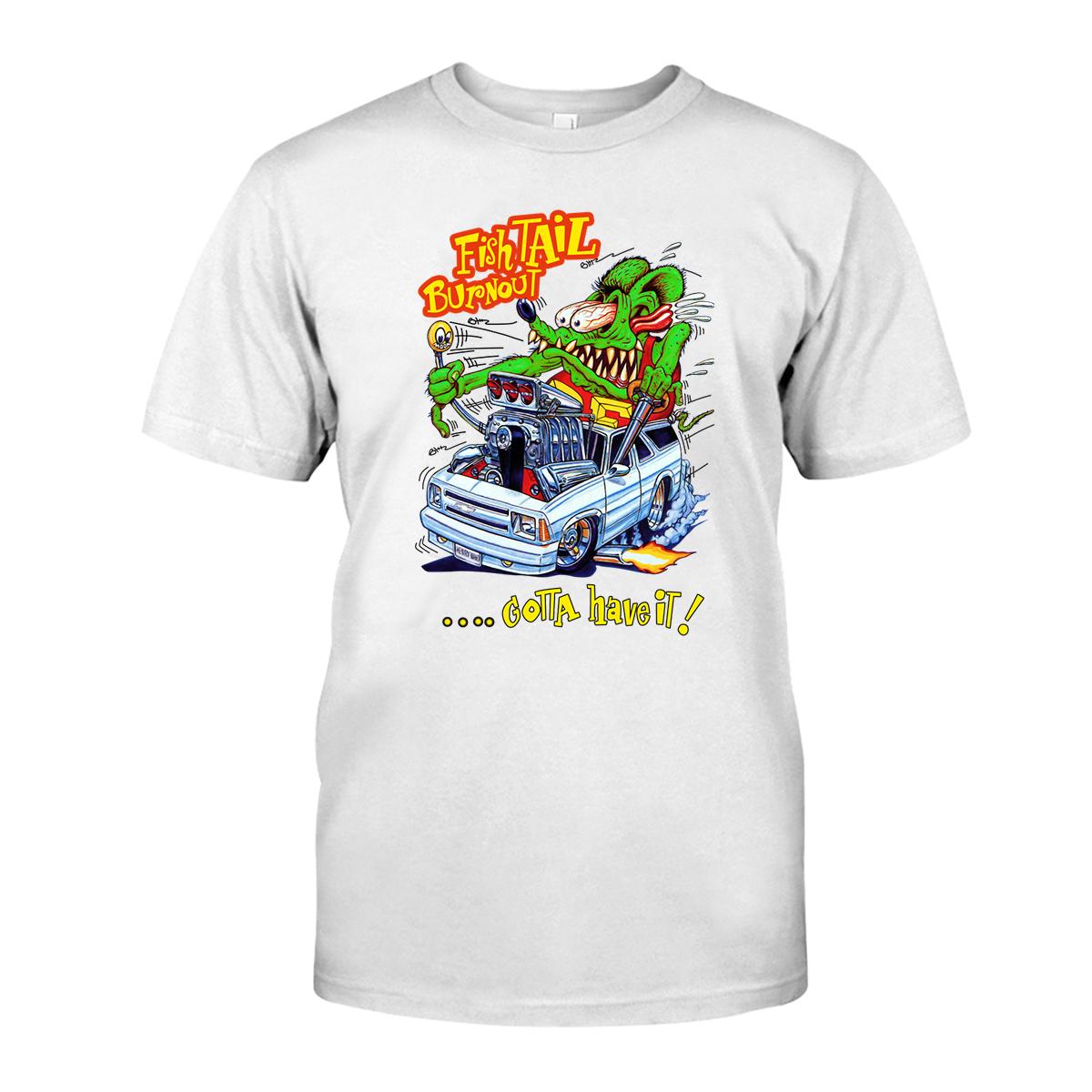 Rat Fink Fish Tail Burnout T-Shirt – smoky, savage, and screaming with raw horsepower. Inspired by underground garage art and the tire-shredding chaos of old-school hot rods, this tee is made for rebels, gearheads, and Kustom Kulture warriors who live for the burnout.