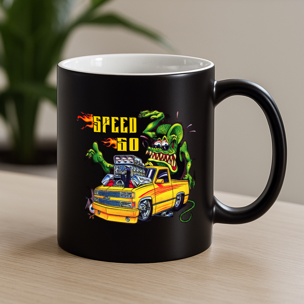 Welcome to TeeTurbo.com, your garage-fueled gear hub. Now you can rev up your mornings with a mug that screams attitude. Inspired by hotrods, Rat Fink chaos, and classic garage grit, this black ceramic mug isn’t just drinkware — it’s a lifestyle statement.